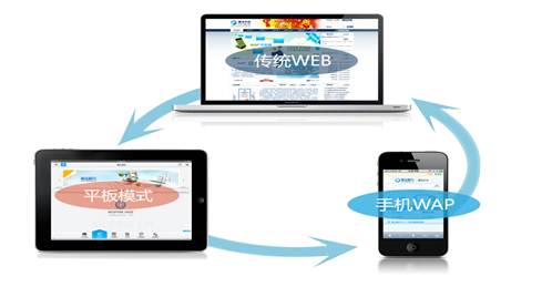何谓“三模建站”?三模概念主要是指一个网站具备三种浏览方式,主要分别针对传统PC、手机、平板电脑。PC主要利用传统 WEB相关的语言(HTML),主要采用鼠标结合键盘的方式浏览网站;手机则使用WAP,主要为了节省流量,非智能机也可以访问,采用手触或者手机键盘浏 览网站;平板电脑表现形式更点动感,更多的采用基于手触、手拨、虚拟键盘等操作方式来进行浏览网站。(如下图所示)